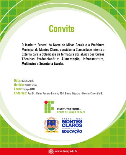 O Instituto Federal do Norte de Minas e a Prefeitura Municipal de Montes Claros realizam no dia 02 de junho, no Espaço OAB do bairro Ibituruna, a solenidade de formatura dos…